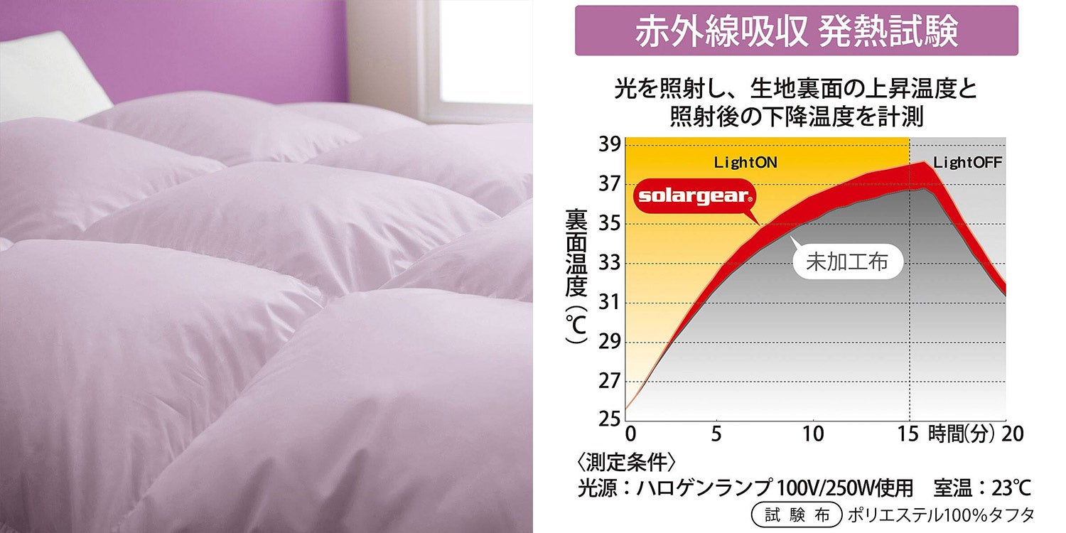 一般的な羽毛掛け布団は、約2.5㎏の重みがありますが、軽量素材の生地を使うことで、製品重量を約30%軽くすることに成功(約1.6㎏)。ダウンが潰れにくくふくらみも最大限に引き出され、さらに生地に発熱機能を持たせることで、ダウンとのダブル効果であたたかくカラダに心地良くフィットする、快適な羽毛掛け布団が完成しました。