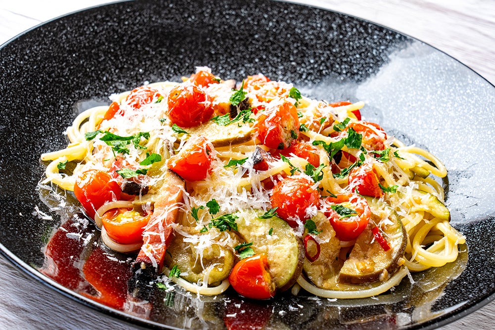 【メニュー名】北海道プレミアムミニトマト「純あま」と農家のベーコン、水茄子のペペロンチーノ