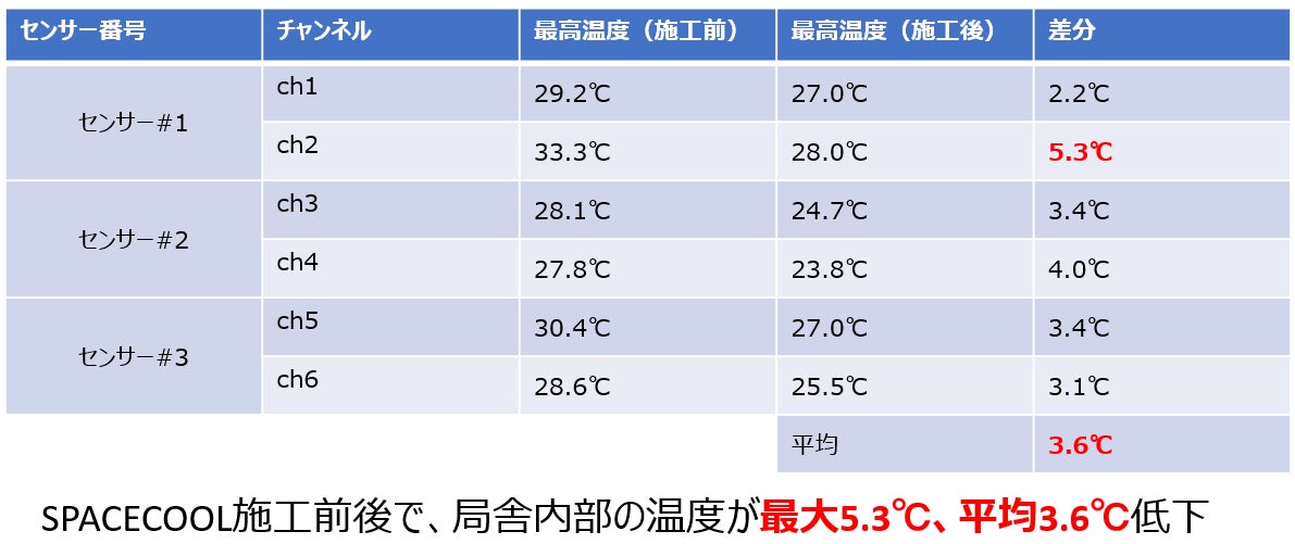そこで、局舎内部の温度上昇を抑制するために本素材を局舎の全面にテスト施工したところ、局舎内部の温度が最大5.3℃、平均3.6℃低下し、エアコンの設定温度を最大4℃上げることができ、消費電力の削減につながったため、この度の採用に至りました。
