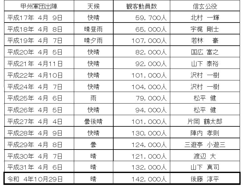 信玄公祭り実行委員会(会長:長崎幸太郎)では、甲府駅周辺及び舞鶴城公園で3年半ぶりに10月28日(金)~10月30日(日)の3日間に渡り開催中の「第49回信玄公祭り」の中間速報として、前夜祭10月28日(金)と甲州軍団出陣当日29日(土)の2日間トータルの観客動員数をここに発表します。2日間の観客動員数は、142,000人を記録し、この数字は2日間トータルで過去最高の記録となりました。