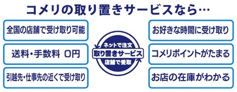コメリのオンラインショッピングサイト「コメリドットコム」やコメリのアプリから利用できる「取り置きサービス」は、注文した商品をご指定の店舗で受け取ることで、本来かかる送料・手数料をかけずに商品をお受け取りいただけます。取り置きサービスは全国のコメリ店舗でご利用いただけます。受け取り場所を仕事先や引っ越し先近くの店舗にすれば、商品を運ぶ手間もかかりません。