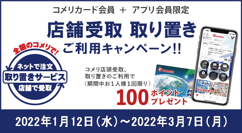 ホームセンターの「コメリパワー」や「コメリハード&グリーン」を通し地域のライフラインとして、地元のプロを応援する株式会社コメリ(所在地:新潟県 新潟市、代表取締役社長:捧 雄一郎)は、オンラインショッピングサイト「コメリドットコム」にて、「店舗受取注文・取り置きサービス」を利用された方に100ポイントが付与される、コメリカード・アプリ会員限定「店舗受取・取り置き ご利用キャンペーン」を2022年1月12日(水)より開催いたします。毎年恒例のお買い得商品盛りだくさんの「コメリドットコム大感謝祭」と合わせて、2022年1月12日(水)~2022年3月7日(月)の期間で実施いたします。