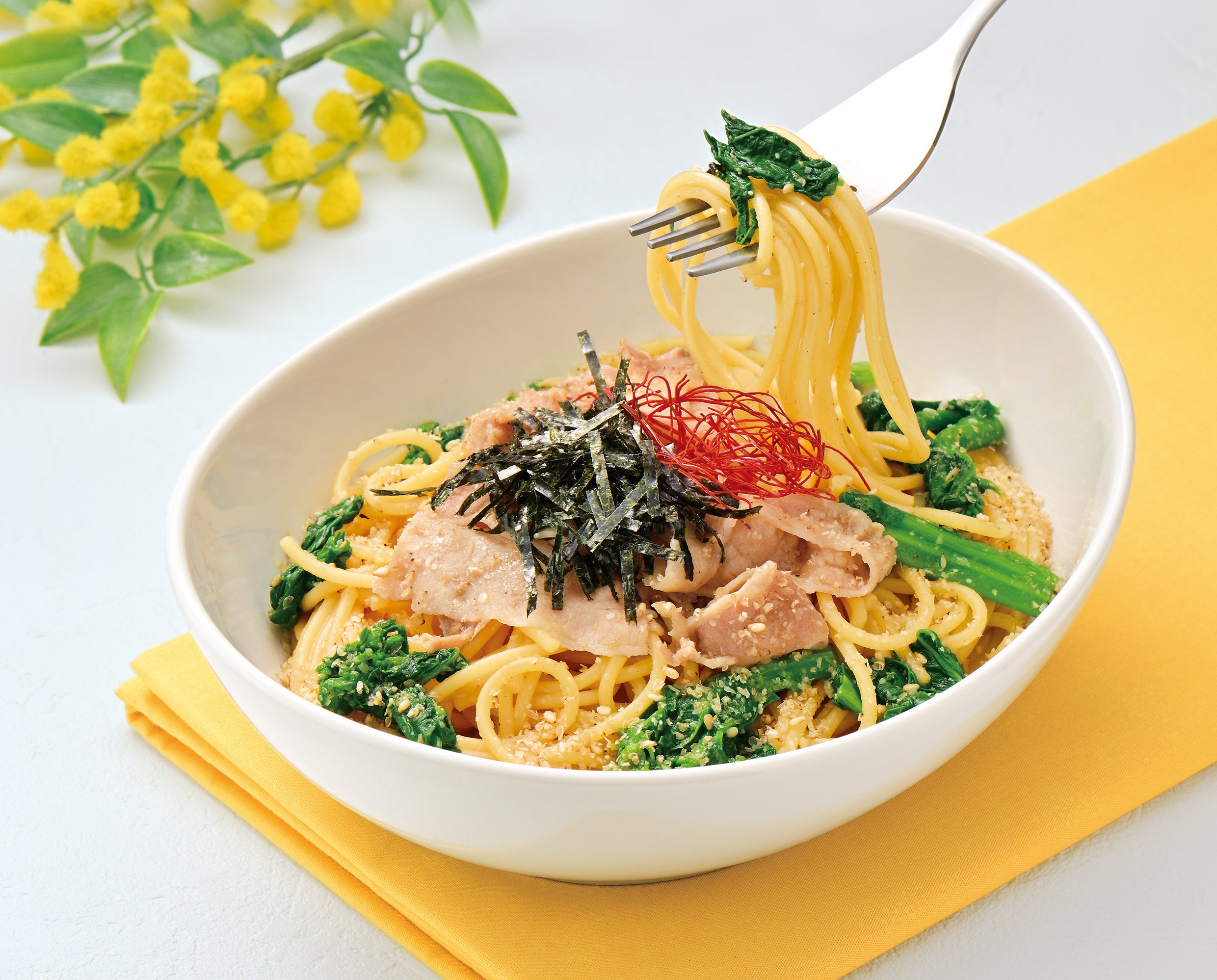 人気のごまだれで味つけした豚しゃぶに春の食材”菜の花”をあわせた、見た目も華やかな季節のパスタです。 |
