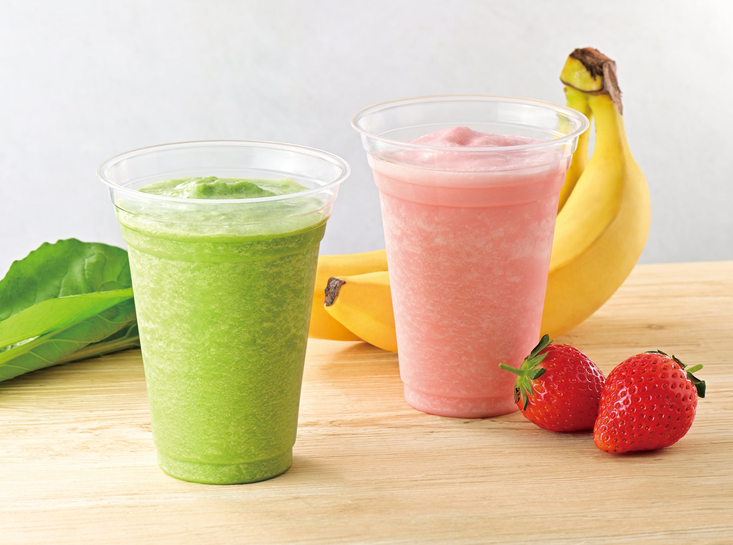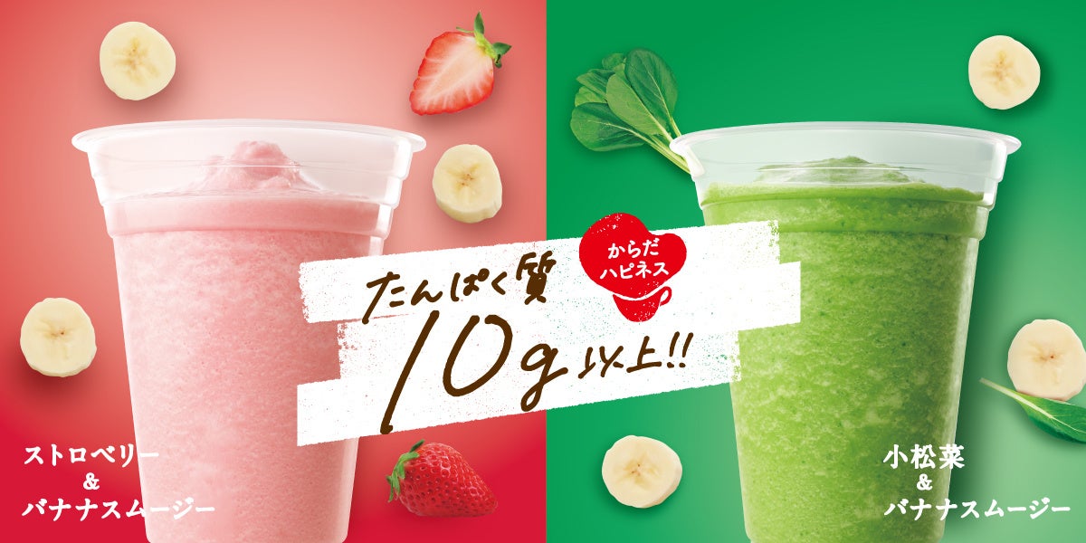 忙しい現代人において手軽にたんぱく質が10g以上摂取できる”からだハピネス”なスムージーが登場します。「ストロベリー&バナナスムージー」は、ストロベリーシロップとフレッシュなバナナを合わせた、春らしい色味のスムージです。「小松菜&バナナスムージー」は、フレッシュな小松菜とバナナを合わせた、さっぱりとした味わいで朝食代わりにもおすすめの1杯です。それぞれのベースには、味にクセのないホエイプロテインパウダーを使用することで、飲みやすい味わいに仕立てています。