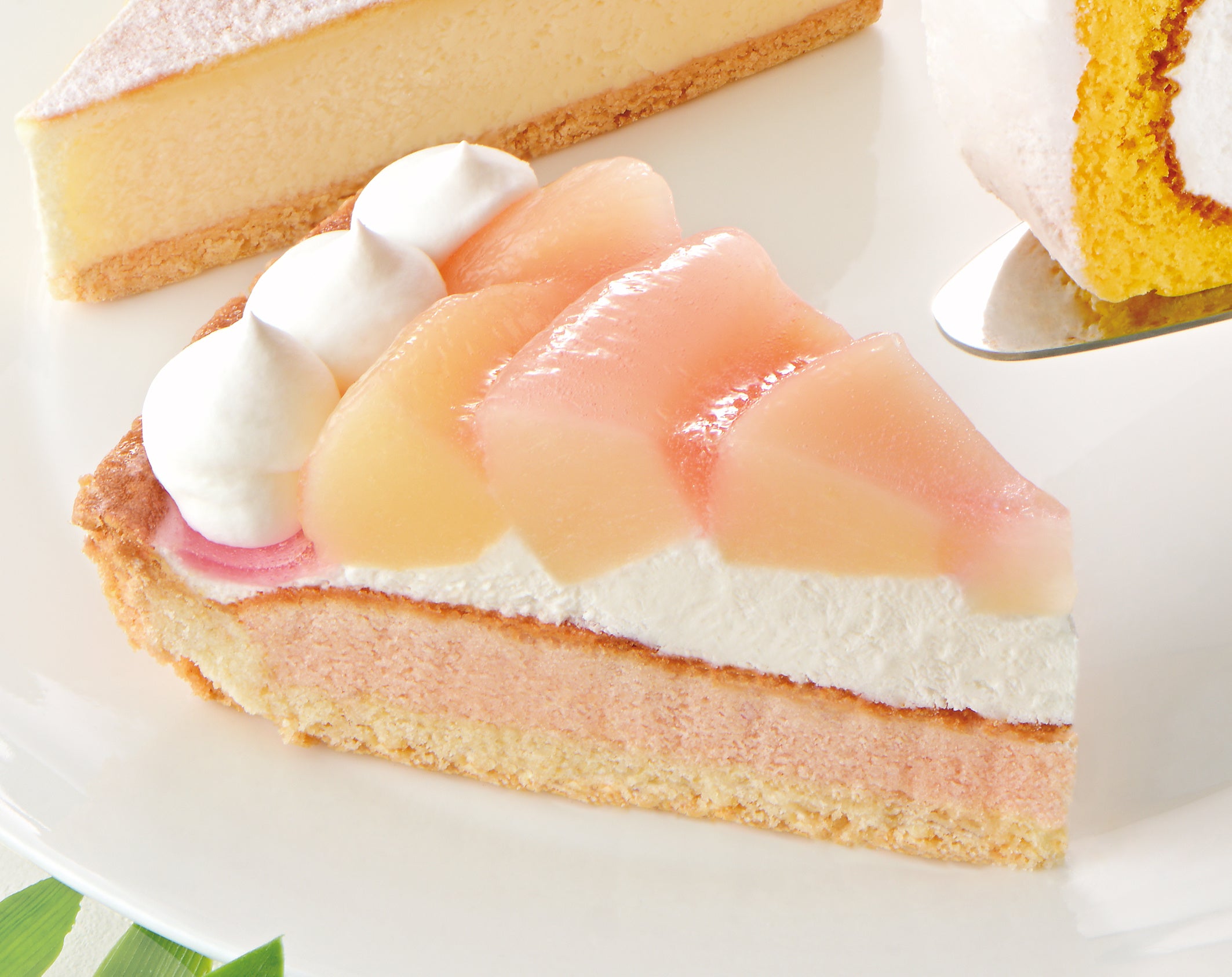 サクサクなタルト生地にほんのり桃の味わいがするパウンド生地にヨーグルトクリームを重ね、白桃の果肉入りゼリーを合わせました。 |
