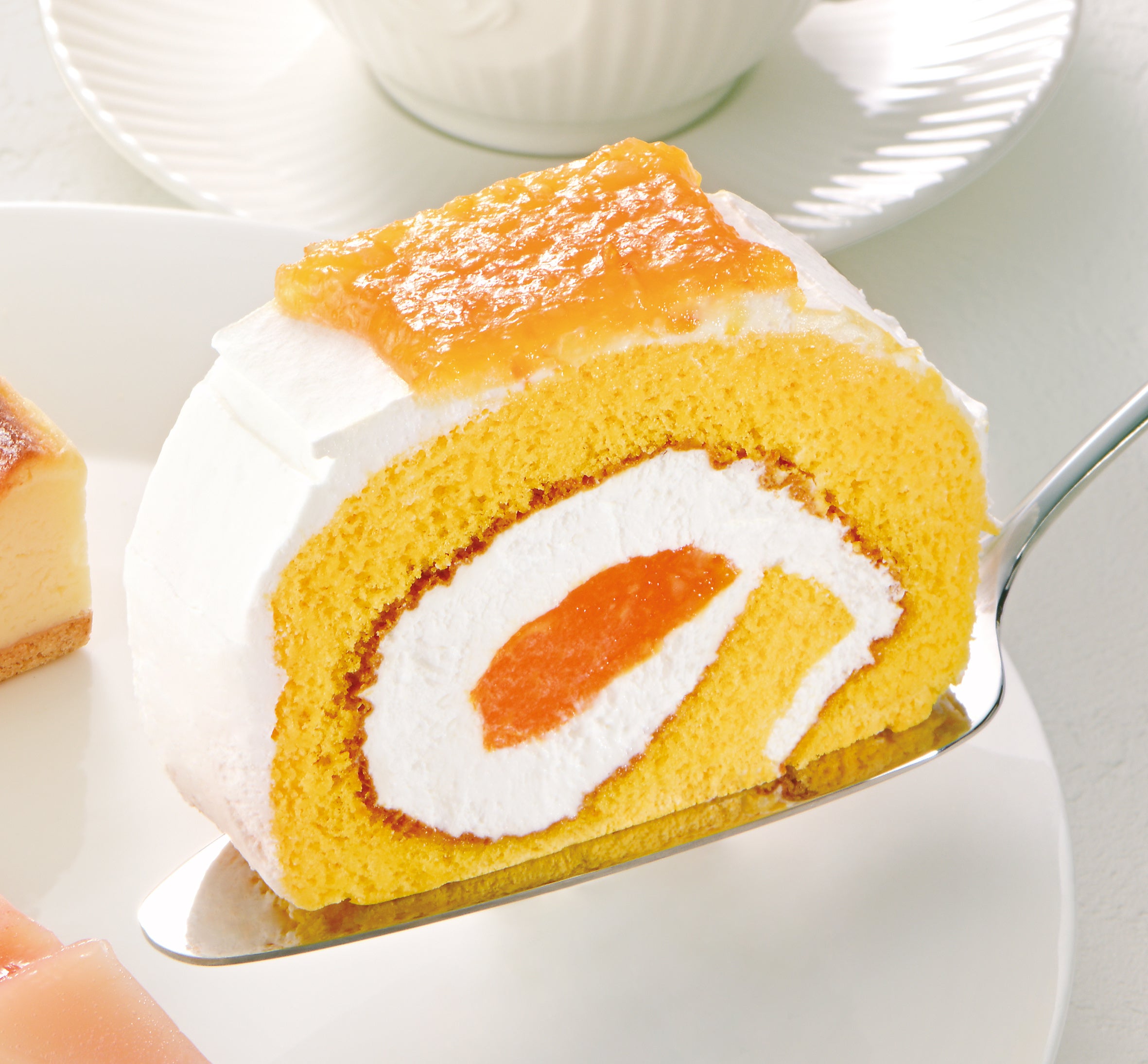 オレンジピール入りのジャムをさっぱりとしたヨーグルトクリームとあわせ、オレンジ色のスポンジ生地でロールしました。 |