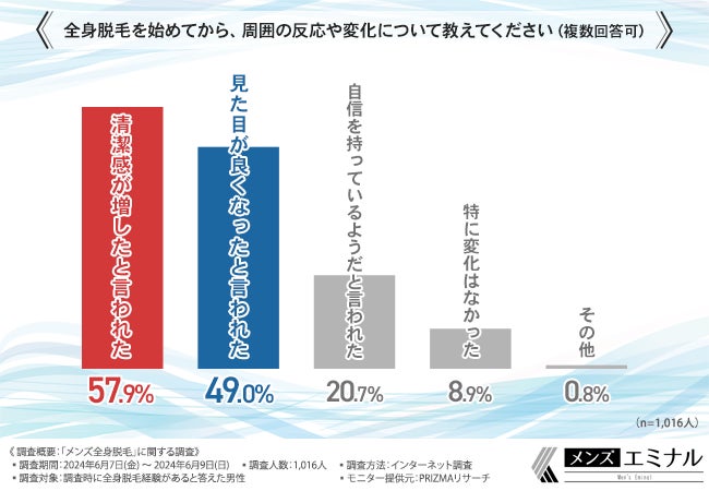 「全身脱毛を始めてから、周囲の反応や変化について教えてください(複数回答可)」と質問したところ、『清潔感が増したと言われた(57.9%)』と回答した方が最も多く、次いで『見た目が良くなったと言われた(49.0%)』と続きました。