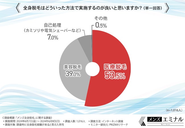 最後に、「全身脱毛はどういった方法で実施するのが良いと思いますか?」と質問したところ、半数以上の方が『医療脱毛(53.5%)』と回答しました。