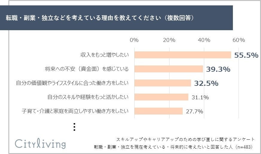 「この先、転職・副業・独立などを視野に入れていますか?」という質問に対し、「現在考えている」が22.3%、「将来的に考えたい」が39.0%と回答しており、合計61.3%の読者がキャリアチェンジを視野に入れていることが判明しました。その理由としては、「収入をもっと増やしたい(55.5%)」が最も多く、次いで「将来への不安(資金面)を感じている(39.3%)」、「自分の価値観やライフスタイルに合った働き方をしたい(32.5%)」が上位を占めており、これは、リスキリングが単なるスキルアップに留まらず、具体的なキャリア変革を目指す読者が多数存在することを示唆しています。