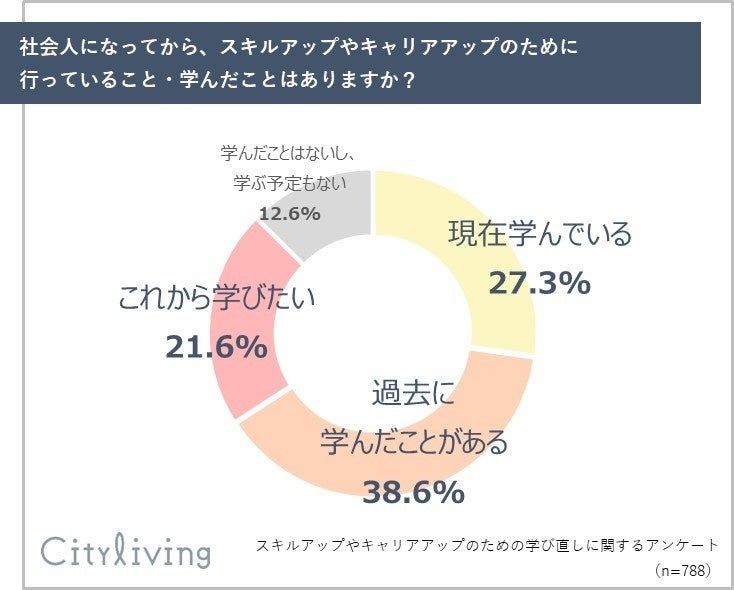 アンケート回答者788名のうち、実に87.4%に及ぶ689名が「現在学んでいる(27.3%)」「過去に学んだことがある(38.6%)」「これから学びたい(21.6%)」のいずれかに該当しており、シティリビング読者=働く女性の学びに対する極めて高い関心と、潜在的な受講意欲が明らかになりました。