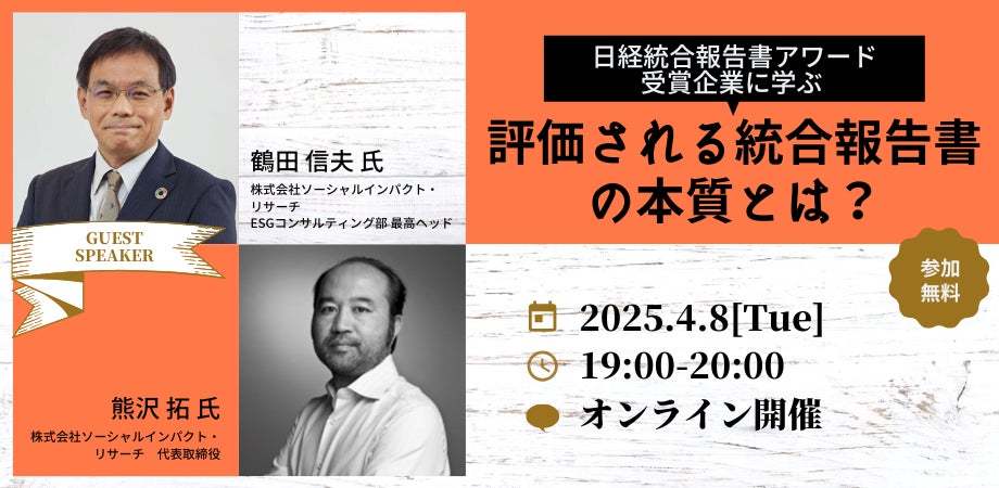 株式会社ソーシャルインパクト・リサーチは、統合報告書・サステナビリティ報告書の作成担当者やIR/サステナビリティ/経営企画/広報部門の責任者・担当者等を対象とした「日経統合報告書アワード受賞企業に学ぶ ― 評価される統合報告書の本質とは?」をテーマにしたオンラインセミナーを4月8日(火)に開催いたします。