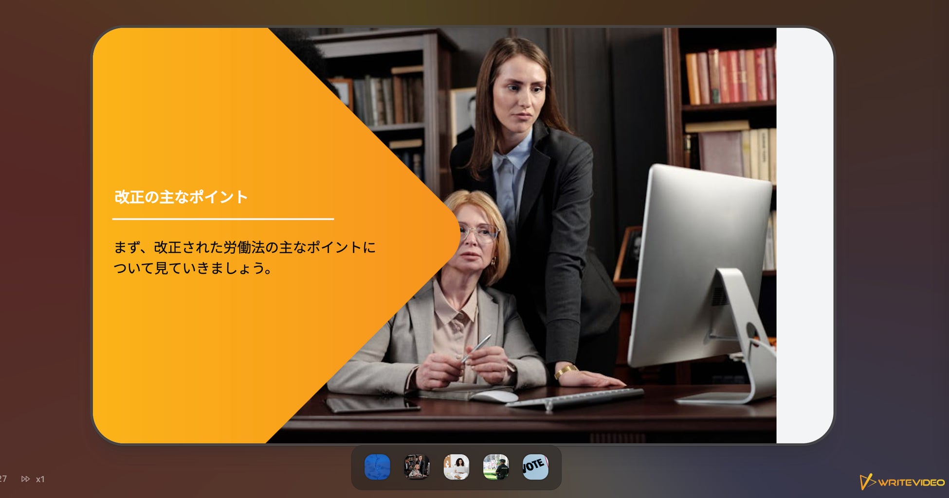 さらに、AIキャラクターを使用することで、肖像権の問題が発生しないため、社員の退職や部署移動による影響を最小限に抑えることができます。企業のコンテンツ制作における柔軟性と効率性を大幅に向上させるWriteVideoを、ぜひご活用ください。