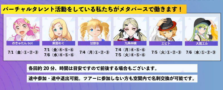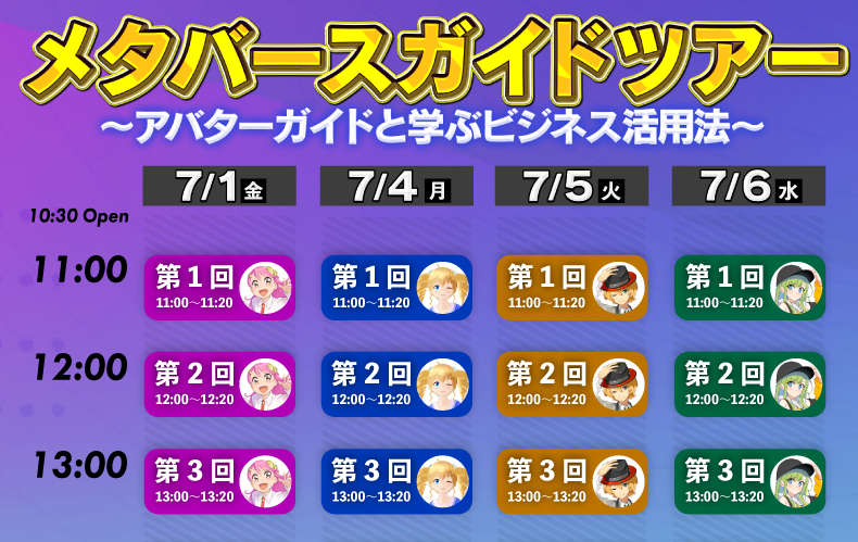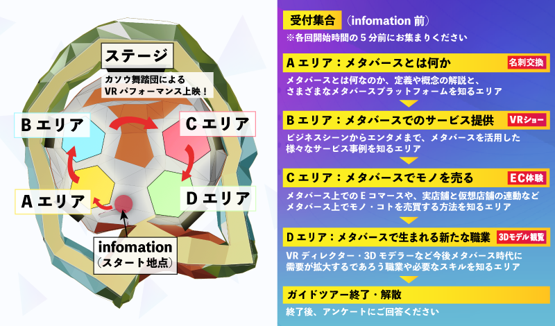 11時~16時20分頃まで、全6回ツアーガイドを行います。メタバース上で活動しているインフルエンサーの皆様が、分かりやすくガイドいたします。