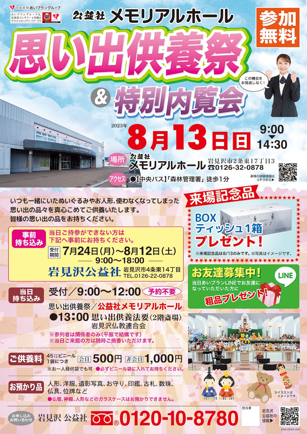 公益社メモリアルホールにて「思い出供養祭&特別内覧会」を8月13日(日)に開催! 人形やぬいぐるみ、思い出の品々をご供養します。7/24~8/12の期間で事前持込もOK