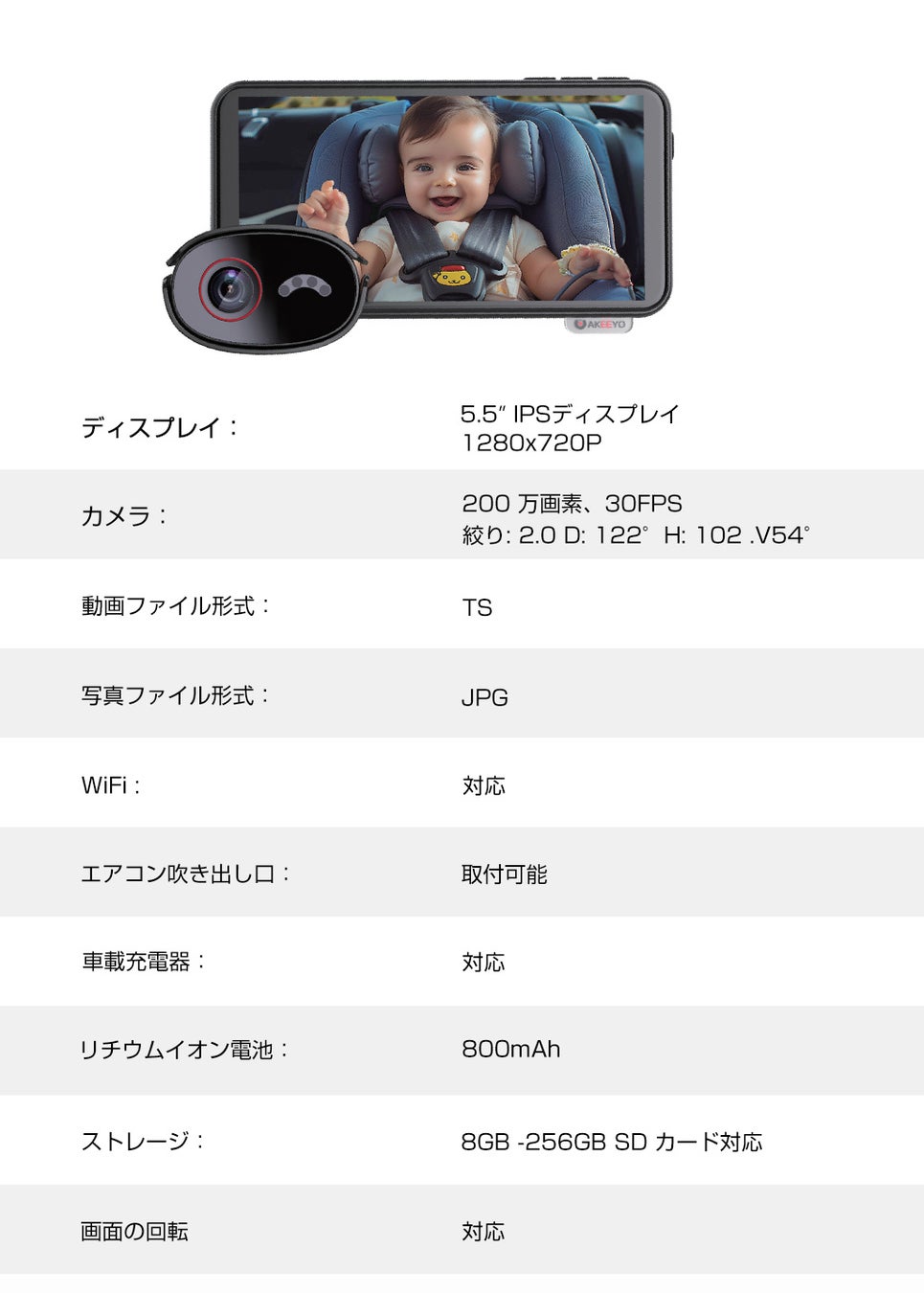 リアルタイムで観察、動画・写真撮影、120°の超広角、夜間視機能、専用アプリ、IPSディスプレイ、置き去り防止機能などの機能が備えっています。