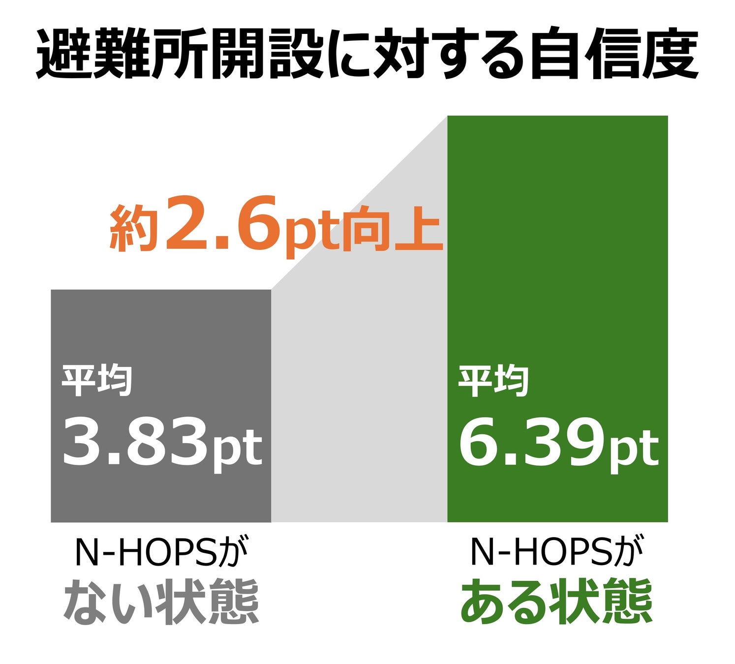 また、アンケートでは、N-HOPSが「ない状態」と比較して「ある状態」では、避難所開設に対する自信度は平均約2.6ポイント向上する結果が得られました(開設の自信度を10段階で回答)。