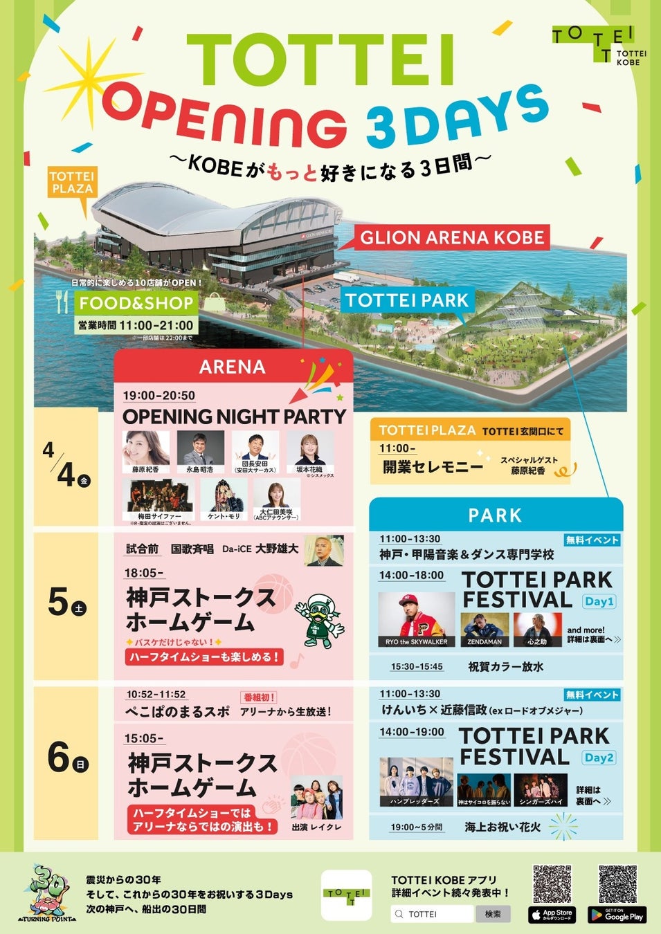 阪神淡路大震災より30年の節目に開業に伴い、次世代アリーナを基点に神戸を盛り上げていきたいという想いを込めて、4月4日(金)~5月3日(土)までの間、「新たな船出を祝う 30Days」をテーマにオープング月間「Turning point 30」として、GLION ARENA KOBEやTOTTEI内でさまざまなイベントを開催します。