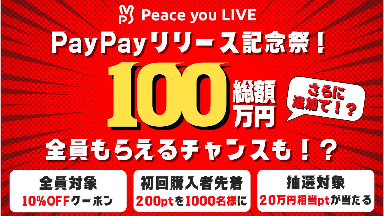 株式会社ピースユー(本社:東京都千代田区、代表取締役:藤瀬公耀)が運営する日本最大級のライブコマースアプリ「Peace you LIVE」(以下「ピースユーライブ」)は、3月19日(水)より支払い方法に「PayPay」を正式に追加したことをお知らせします。また、導入を記念して総額100万円以上を還元する『PayPayリリース記念祭』を開催します。