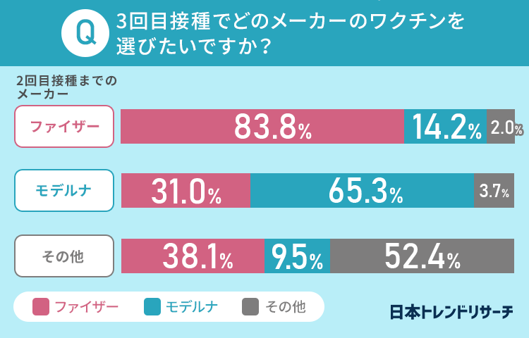 一方、過去2回の接種で「ファイザー」を接種した方の14.2%、「モデルナ」を接種した方の31.0%は3回目接種で「違うメーカーを選びたい」と回答しています。