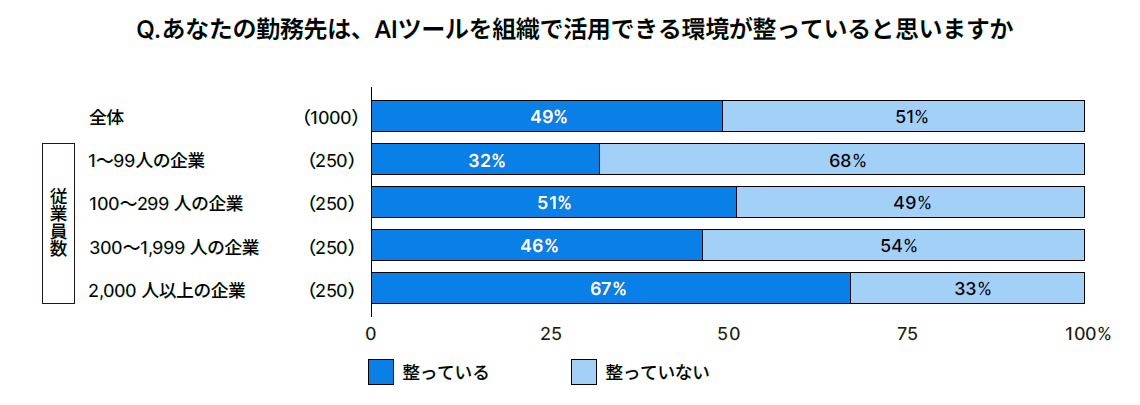 組織のAI活用環境については「整っている」49%、「整っていない」51%と真っ二つに分かれており、企業規模による格差が顕著。