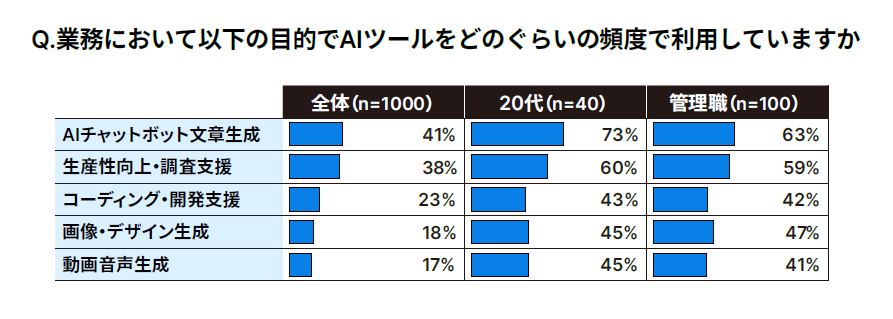 AIツールの利用頻度について64%が週1日以上利用、20%以上が毎日利用しているという結果は、AIがすでに多くのナレッジワーカーにとって日常的なツールとなっていることを示しました。用途別で見ると、週に1回以上の利用率は、文章生成・チャットボット(41%)が最も高く、次いで生産性向上・調査支援(38%)、コーディング・開発支援(23%)と続きます。全ての用途において、20代と管理職は他の世代や非管理職に比べて、より高頻度で多岐にわたる業務に活用している傾向が見られました。