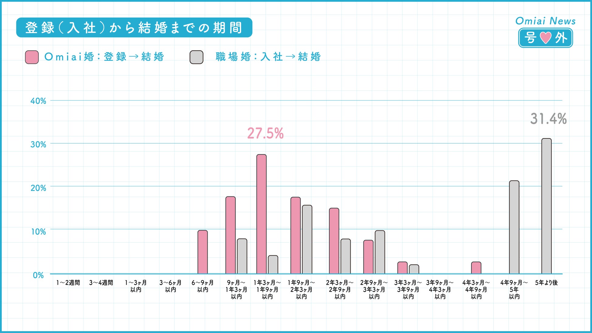 マッチングアプリ「Omiai」で出会い結婚した会員40名と職場恋愛を経て結婚した方(職場婚した方)51名、計101名の方に出会いから結婚までの期間をそれぞれインターネット調査にて行いました。職場婚の出会いから結婚までの期間の最多は「5年以上」、Omiai婚は「1年3ヶ月〜1年9ヶ月」となり、Omiai婚は職場婚の約1/3という結果になりました。