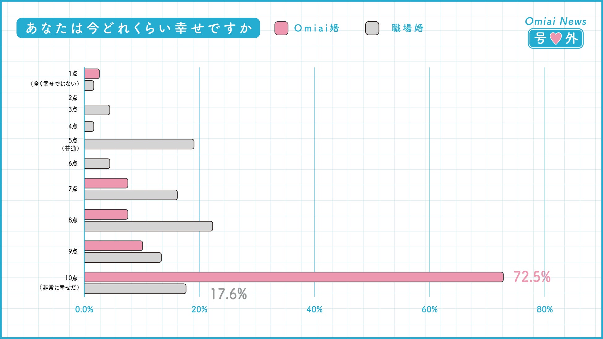 あなたは今どれくらい幸せですか?という問いに対し、10点(非常に幸せだ)と回答した方はOmiai婚が7割以上という結果に対し、職場婚は2割未満と大きな差