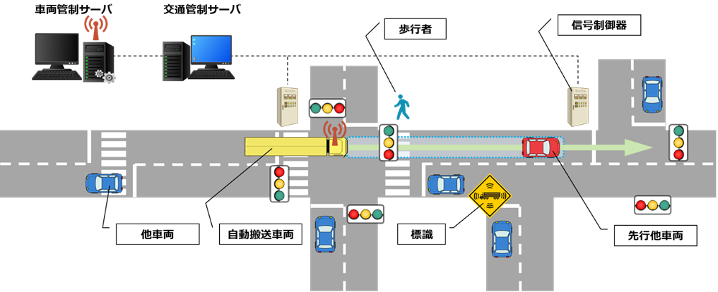 交通管制サーバは、自動搬送車両の走行状況に応じて信号機などを制御するとともに、車両管制サーバに対し進行・停止を指示することで、交差点や横断歩道の交通整理を行い、自動搬送車両の安全かつスムーズな走行を実現します。