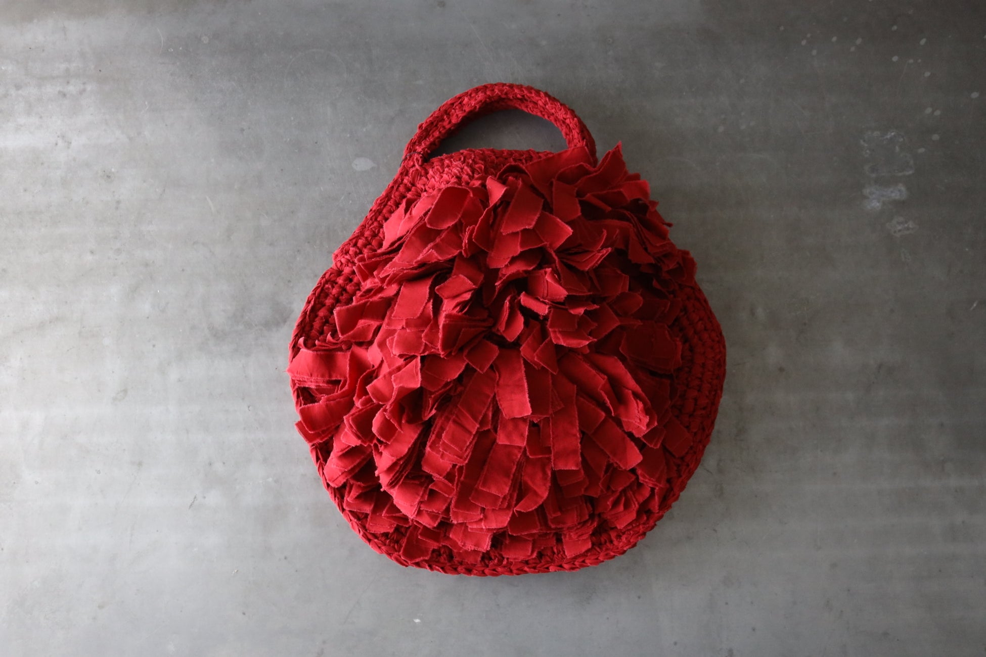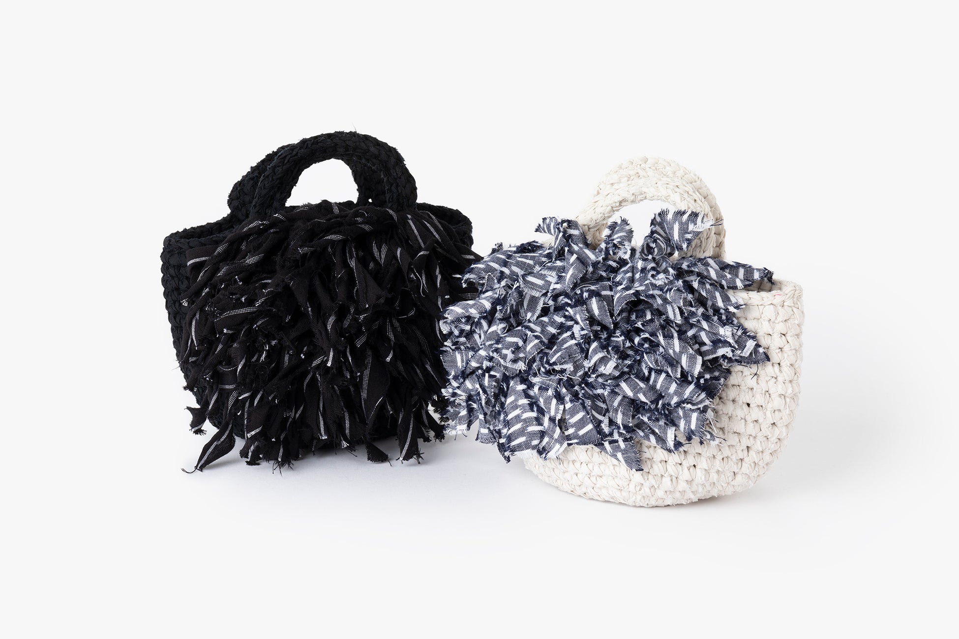 ひとつひとつに思いこめて河村さんが作られる「MIKI KAWAMURAの裂き編みバッグ」は、手で布を裂き糸を作るところからはじまる手編みのバッグ。象徴的な「フリンジ」部分は、ときに満開の「花」のようにも見えたり、ときにふわふわの「鳥の羽」のようにも見えたり。持つときどきで、くるくると巧みに表情を変えて、持つ人の個性にそっと寄り添ってくれるような、魅力的なバッグです。