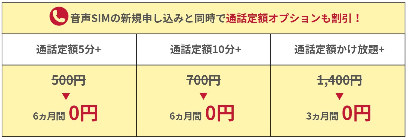 申し込み期間中に、ギガプランを新規契約または他社からのお乗り換え(MNP)でお申し込み、またはご利用中の方が通話定額オプションをお申し込みいただいた場合、オプションの月額料金が利用開始月から最大6ヵ月間0円でご利用いただけます。 割引期間は以下となります。 ・通話定額5分+、通話定額10分+:6ヵ月間月額料金0円 ・かけ放題+:3ヵ月間月額料金0円 |