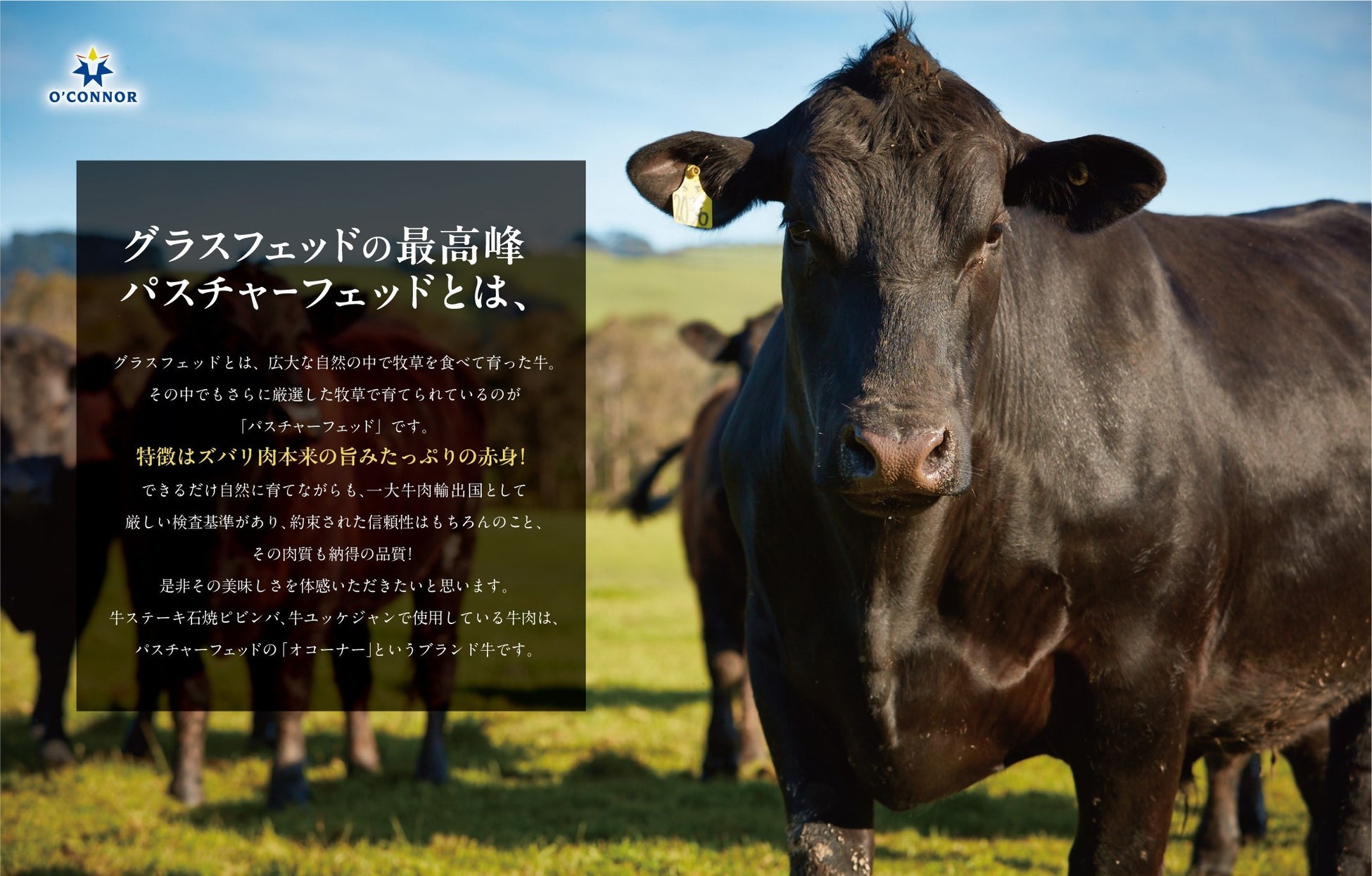 シジャンの牛ステーキ石焼ピビンバには、オーストラリアの厳しい検査基準をクリアしたパスチャーフェッドビーフの「オコーナー」というブランド牛を使用しています。