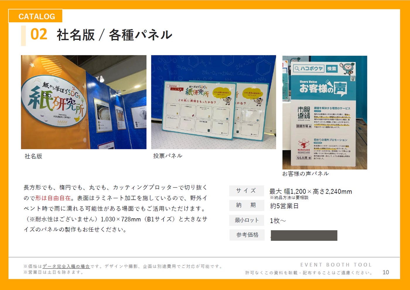 1点から注文できる展示パネルやブース装飾タペストリーなど。参考価格も記載しています。