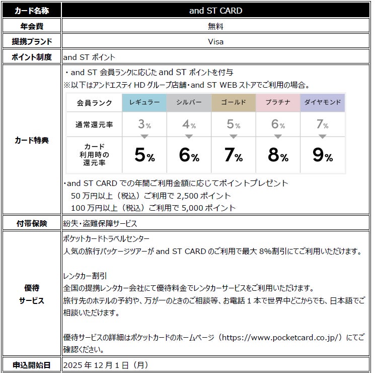 ポケットカード株式会社(本社:東京都港区、代表取締役社長:髙垣 晴雄、以下「ポケットカード」)は、アンドエスティHDグループでモール&メディア事業やプロデュース事業を展開する株式会社アンドエスティ(本社:東京都渋谷区渋谷2-21-1、代表取締役社長CEO:木村 治、以下「アンドエスティ」)と提携し、2025年12月1日より「and ST CARD」の募集を開始いたします。
