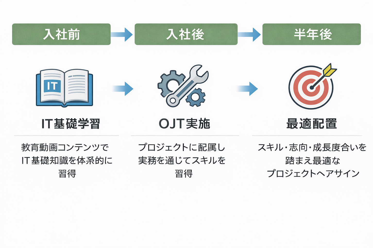育成プログラムの最大の特徴は、教科書的な座学を最小限に抑え、実際のプロジェクトを通じて技術を身につける「実践型OJT」にあります。