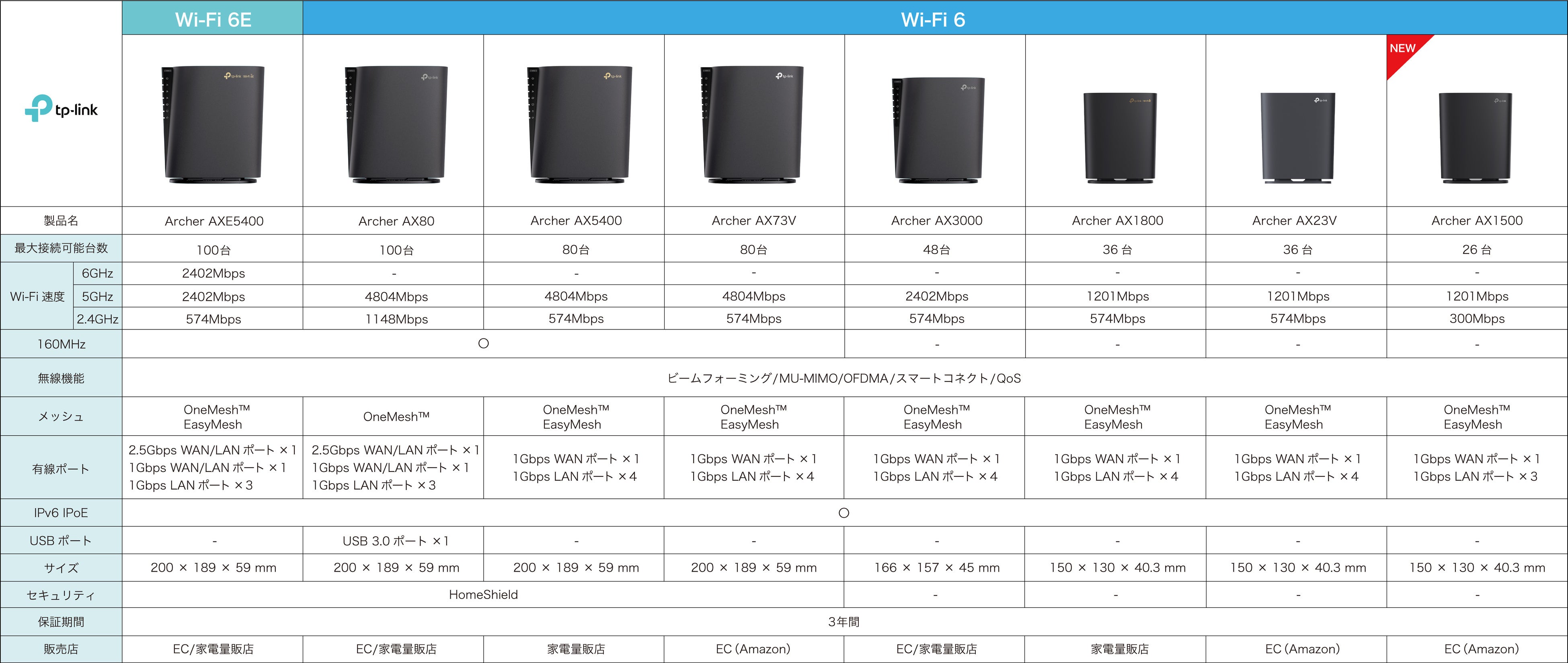 日本ユーザーの声を反映して誕生した同シリーズは、発売より多くの方にご好評いただいております。今回新たに追加された「Archer AX1500」はエントリークラスに位置し、お手頃Wi-Fi 6ルーターとしてラインナップ幅を広めます。