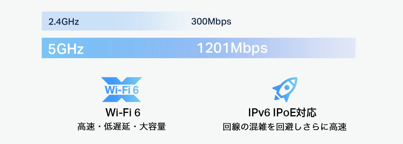 ・ Wi-Fiスピード*2:1201Mbps (5GHz,11ax/ac/n/a,HE80) + 300Mbps (2.4GHz,11n/g/b)