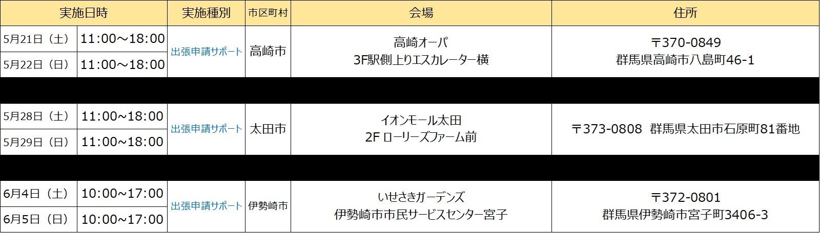 ※開催場所の調整状況や新型コロナウィルスの感染状況等により、「出張申請受付」及び「出張申請サポート」の開催を中止・延期、または実施内容が変更となる可能性がございます。