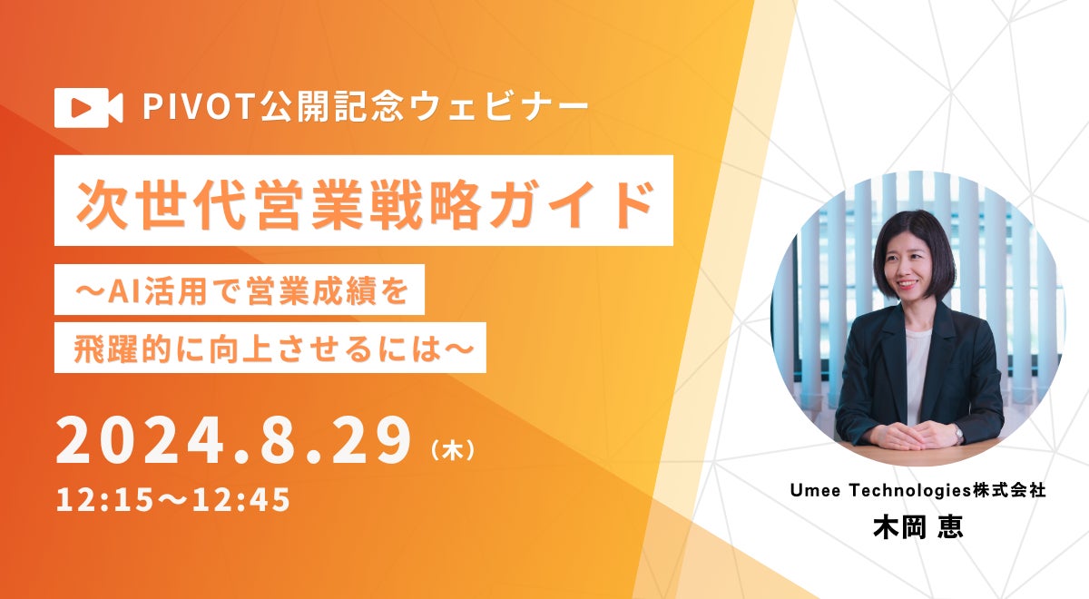 新人からトップセールスを輩出するコネクテッドセールス・プラットフォーム*「Front Agent」を開発・提供するUmee Technologies株式会社(本社:東京都調布市、代表取締役:新納 弘崇、以下「ユミー」)は、8月29日(木)12:15〜12:45にPIVOT公開記念ウェビナー「次世代営業戦略ガイド~AI活用で営業成績を飛躍的に向上させるには~」を開催いたします。