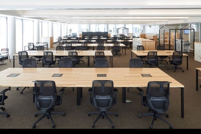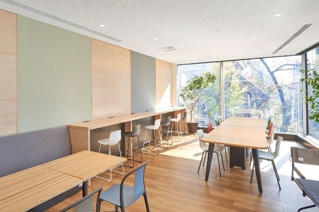 現在のNOK本社ビルは、グローバルにモノづくりを展開するNOKグループの本社機能を担う中枢拠点として、2020年9月に竣工しました。「Borderless」をコンセプトに、社会とのつながりを大切にし、社内外のメンバーと横断的にコミュニケーションを取りやすい環境を整え、個々の成長を促すオフィスとしてデザインされています。室内には福井県産の杉や埼玉県産のヒノキなど、国産木材を多く使用し、温かみのあるオフィス空間を創出するとともに、地球温暖化防止にも貢献しています。