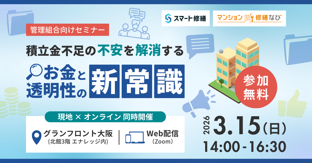 「2026年のマンション防衛策:積立金不足の不安を解消する『お金』と『透明性』の新常識」無料セミナー3月15日(日)開催のお知らせ【スマート修繕×マンション修繕なび共同企画】