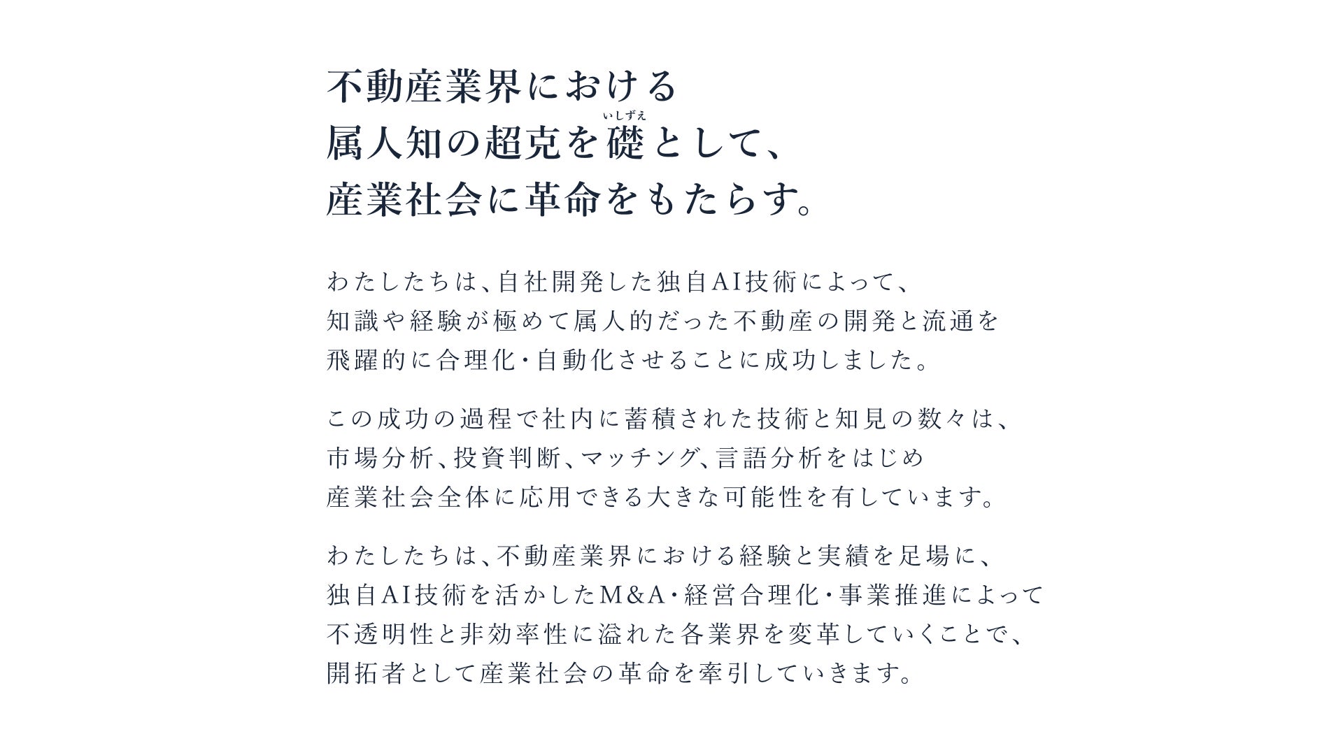 創業以来、私たちは独自AIを不動産の開発および流通事業に実装して成長を遂げてきました。今、そのリアルビジネスで得た実績と知見を礎とし、業界の垣根を越える「AIネイティブカンパニー」へと進化すべく、組織体制を新たにします。今回の経営体制変更により、技術領域(エンジニアリング、プロダクト開発)およびコーポレート領域(法務、財務)の専門性を強化し、AI企業としての実質的な経営基盤を構築してまいります。