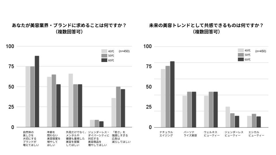 女性の価値が外見で判断されていると感じた経験があり、かつ、社会に美の基準が存在していると回答した女性450名を対象に「美容業界・ブランドに求めること」について質問したところ、年代問わず「自然体の美しさを大切にするブランドが増えること」を最も求めていると回答しました。さらに、「未来の美容トレンドとして共感できること」について質問したところ、年代問わず、年齢に逆らったり無理に若く見せず、自然な美しさを楽しむ「ナチュラルエイジング」が最も共感されることがわかりました。