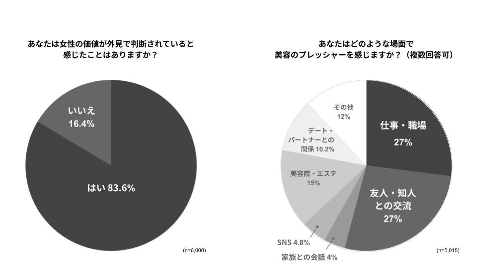 今回の調査では、社会の中で「女性の価値が外見で判断されている」と感じた経験がある人は83.6%にものぼることが明らかになりました。さらに、「どのような場面で美容のプレッシャーを感じますか」という問いに対して、「女性の価値が外見で判断されている」と感じた経験のある人においては、27%の人が「仕事・職場」、「友人・知人との交流」と回答しており、特に人とのコミュニケーションが重要視される公の場において美容や外見に対してのプレッシャーが大きいと感じていることがわかりました。