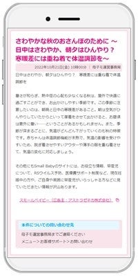 第一弾は、アストラゼネカと連携し、『母子モ』登録者のうち、妊娠中もしくは月齢12カ月以下の子どもの保護者に対し、アストラゼネカが専門医師の監修を受けて作成した早産児やRSウイルス感染症に関するポータルサイト「SmallBaby(https://www.small-baby.jp/ )」に収載されている情報の一部を『母子モ』にて配信します。
