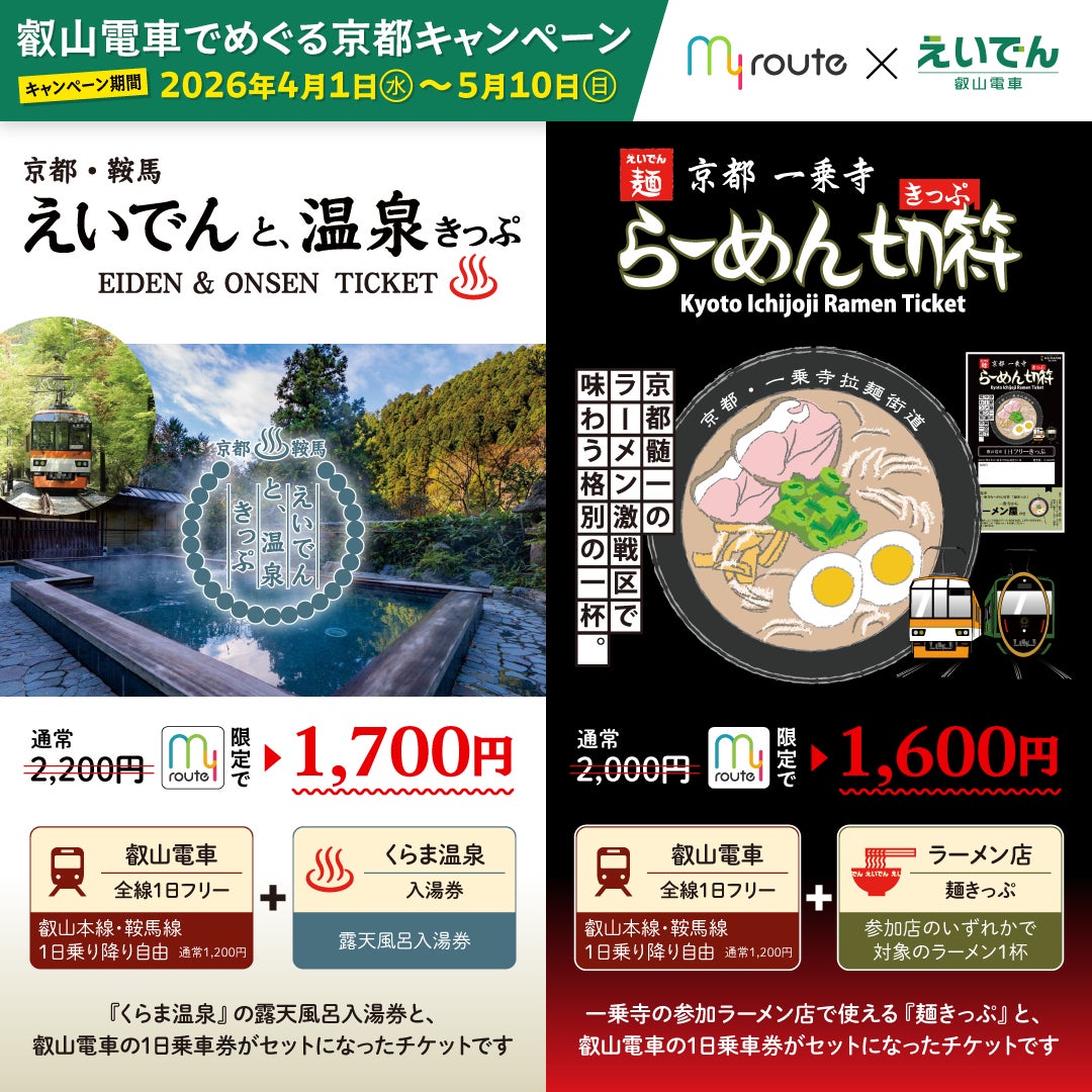 本キャンペーンでは、叡山電車沿線の人気観光スポットである鞍馬・貴船エリアや、京都屈指のラーメン激戦区として知られる一乗寺エリアをお得に巡ることができるデジタル乗車券を、my route限定の特別価格で期間限定販売します。