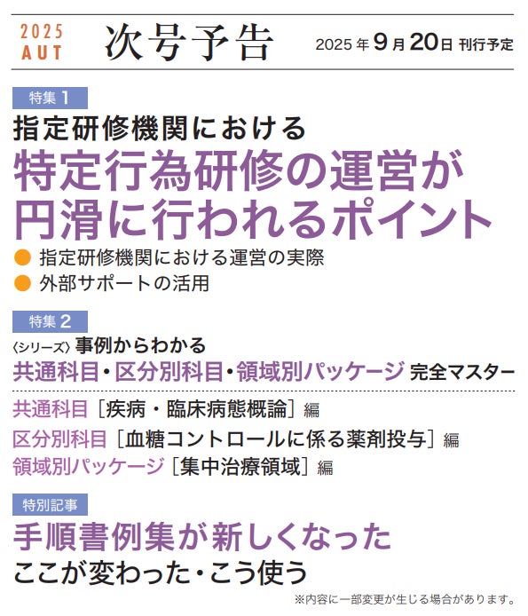 「特集1」では特定看護師による医師・多職種・地域との連携実践を、「特集2」では研修中から資格取得後まで続く“学び”の工夫と勉強法を紹介。特定行為の実践力と成長を支えるヒントが満載です。