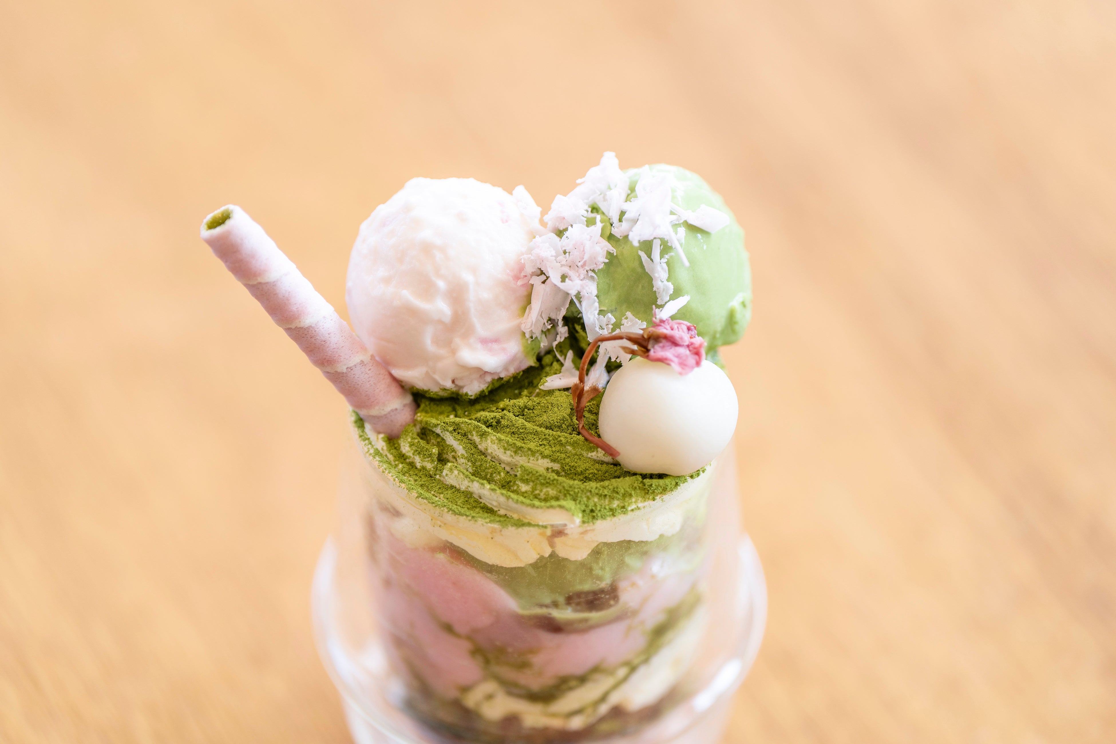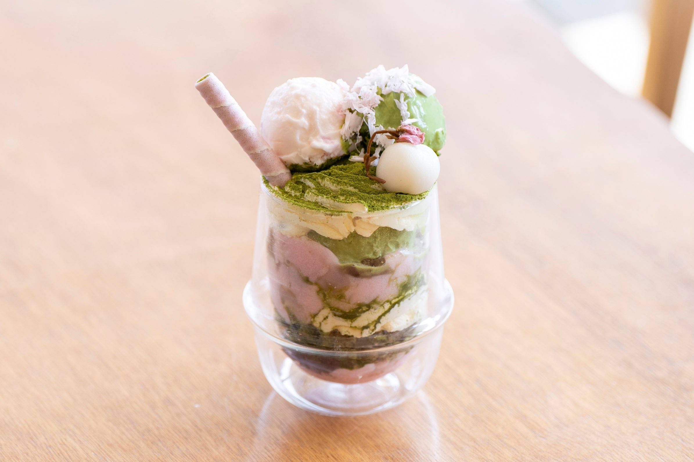 抹茶アイスをベースに粒あん、白玉、桜アイス、桜ミルクプリンを組み合わせ、ティラミスのように仕上げたパフェをご用意いたしました。