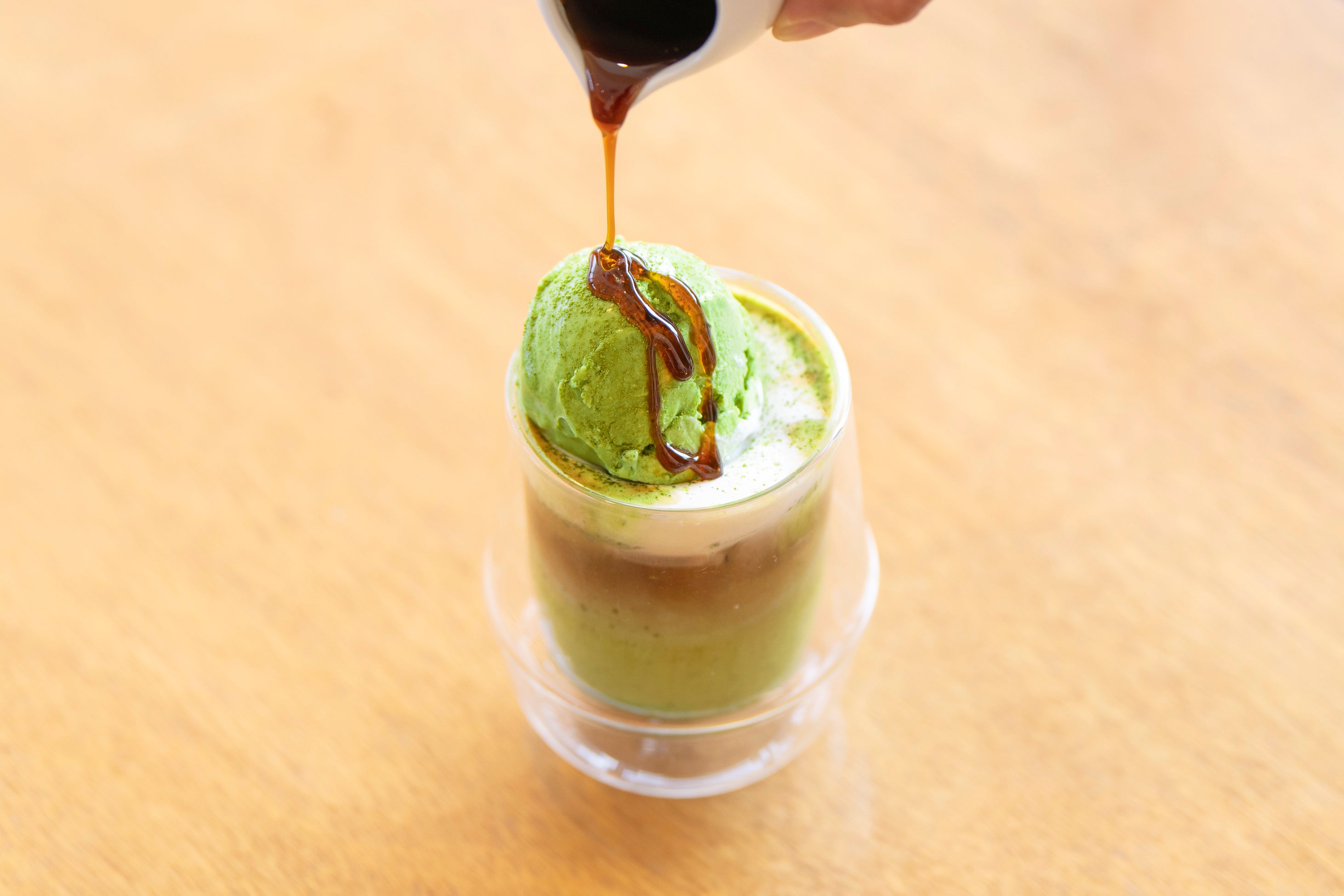 香りと苦みのバランスが良い抹茶アイスをベースに濃厚な抹茶ソースと黒蜜を組み合わせました。トッピングの黒蜜をお好みでかけてお楽しみください。