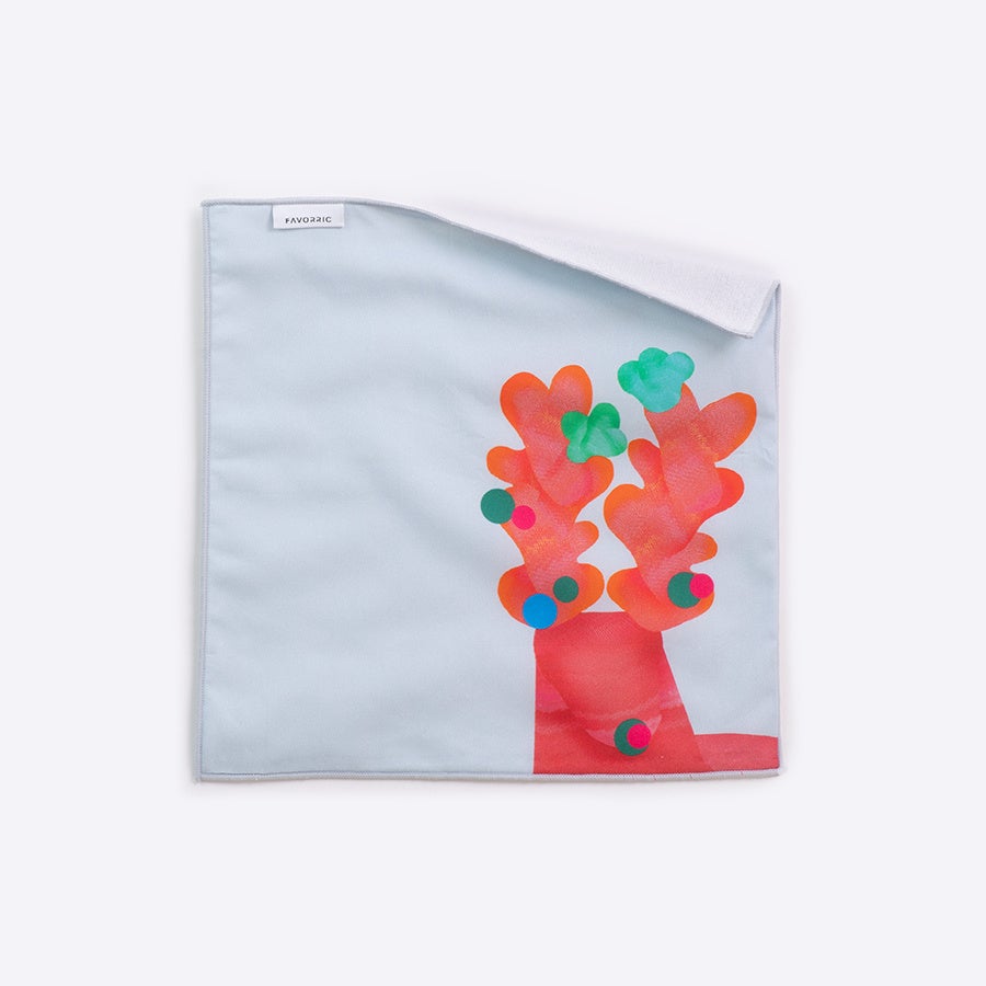 今回、代表作「room」「joy」「bloom」を、FAVORRICのアートブランケット・クッションカバー・フラットサブバッグ・タオルハンカチとして展開します。