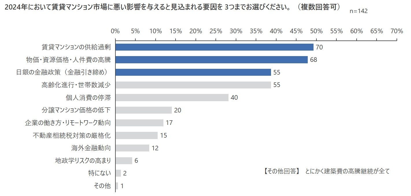 賃貸マンション市場に悪い影響を与えると見込まれる要因については、「供給過剰」が最も多く、「高齢化の進行・世帯数減少」の割合が前回比で増加しており、需給バランスの不均衡が今後の懸念事項となっている。また、物価・資源価格・人件費高騰が2番目に多く、建築費や管理運営コストの上昇分を賃料に反映しきれない状況もあり、マイナス要因と見られている。